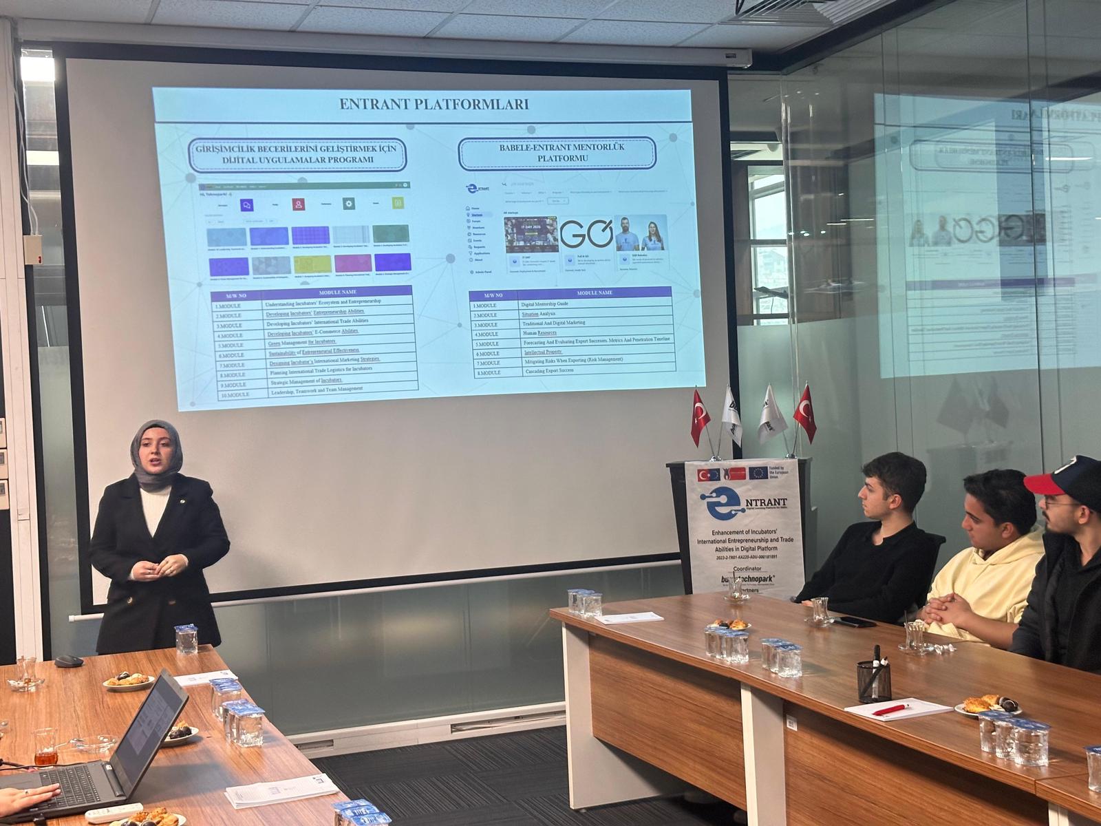 Proje Uzmanı Havanur YILMAZ tarafından yapılan sunumda, ENTRANT Projesi’nin dijital bir platform aracılığıyla kuluçka firmalarının uluslararası girişimcilik ve ticaret kapasitelerini geliştirmeyi amaçladığı ifade edildi. Proje kapsamındaki iş paketleri, geliştirilen eğitim-mentörlük platformları ve içerdikleri eğitim modülleri hakkında bilgi paylaşıldı. Ayrıca girişimcileri ve sektör temsilcilerini bir araya getiren Techno Talks Başarı Hikayeleri ve Webinar Serisi anlatılarak yeni gerçekleştrilecek olan webinarlara öğrenciler davet edildi.