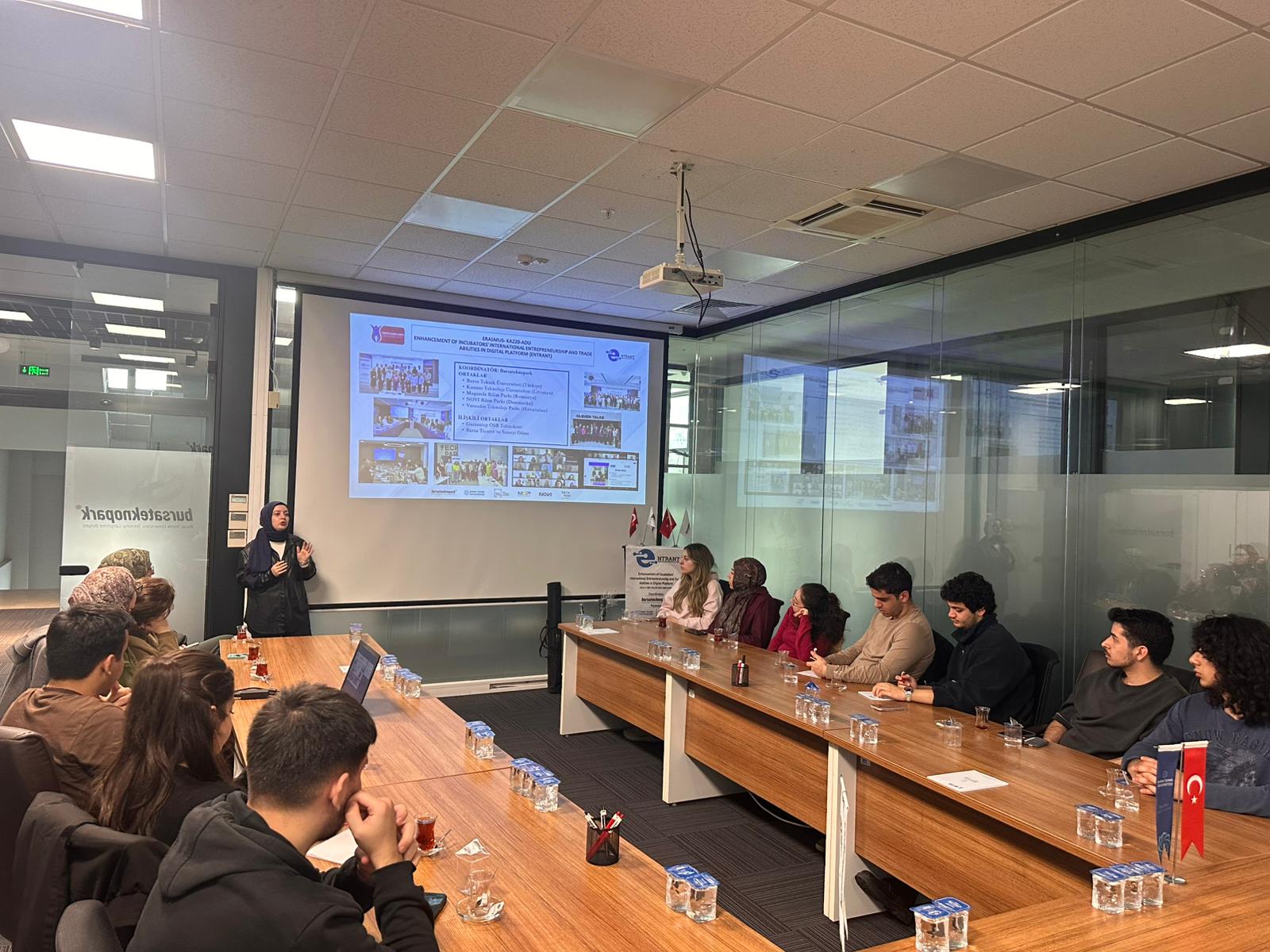 Bursateknopark’ın koordinatör olarak yürütmekte olduğu Erasmus+ KA220-ADU çağrı kodlu ENTRANT (Enhancement of Incubators’ International Entrepreneurship and Trade Abilities in Digital Platform) projesi, Gençlik ve Spor Bakanlığı destekli ÜNİDES Projesi kapsamında Bursateknopark’ı ziyarete gelen Konya Gıda ve Tarım Üniversitesi Organizasyon ve Sosyal Etkileşim Topluluğu ile Ankara Yıldırım Beyazıt Üniversitesi Ar-Ge ve Koordinasyon Kulübü öğrencilerine tanıtıldı.