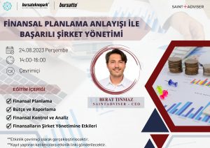 Bursateknopark-SaintAdviser işbirliği ile gerçekleştirilecek olan Finansal Planlama Anlayışı ile Başarılı Şirket Yönetimi eğitimi 24 Ağustos 2023 Perşembe günü 14:00-16:00 saatleri arasında Zoom Webinar platformundan düzenlenecektir.
