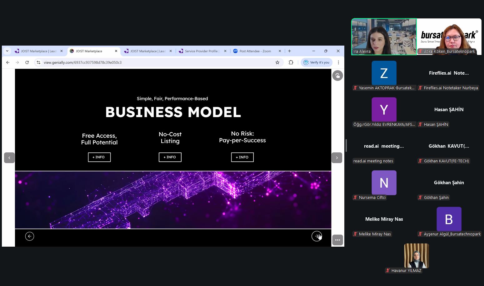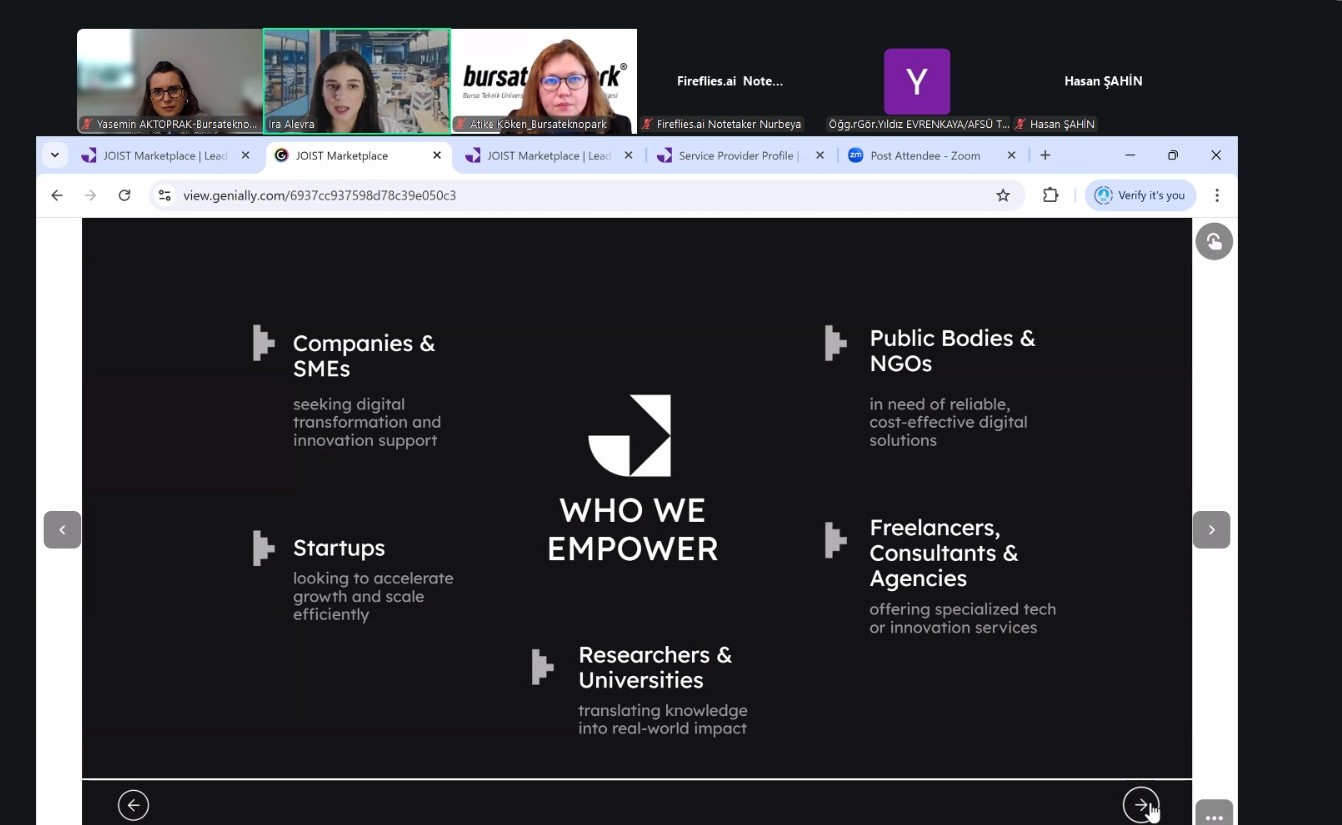 Bursateknopark’ın Güneydoğu Avrupa Bilim ve Teknoloji Parkları Birliği (SEE Science and Technology Parks Alliance) kurucu üyeleri içerisinde birlikte yer aldığı JOIST Innovation Park iş birliğiyle JOIST Marketplace Platformu’nun bilgilendirme toplantısı gerçekleştirildi. Webinarda JOIST Innovation Park İş Geliştirme ve Muhasebe Müdürü Ira ALEVRA tarafından JOISTPARK’ın hibrit fiziksel ve dijital inovasyon ekosisteme katkı sağlamasını amaçlayan Marketplace B2B platformu tanıtıldı.
