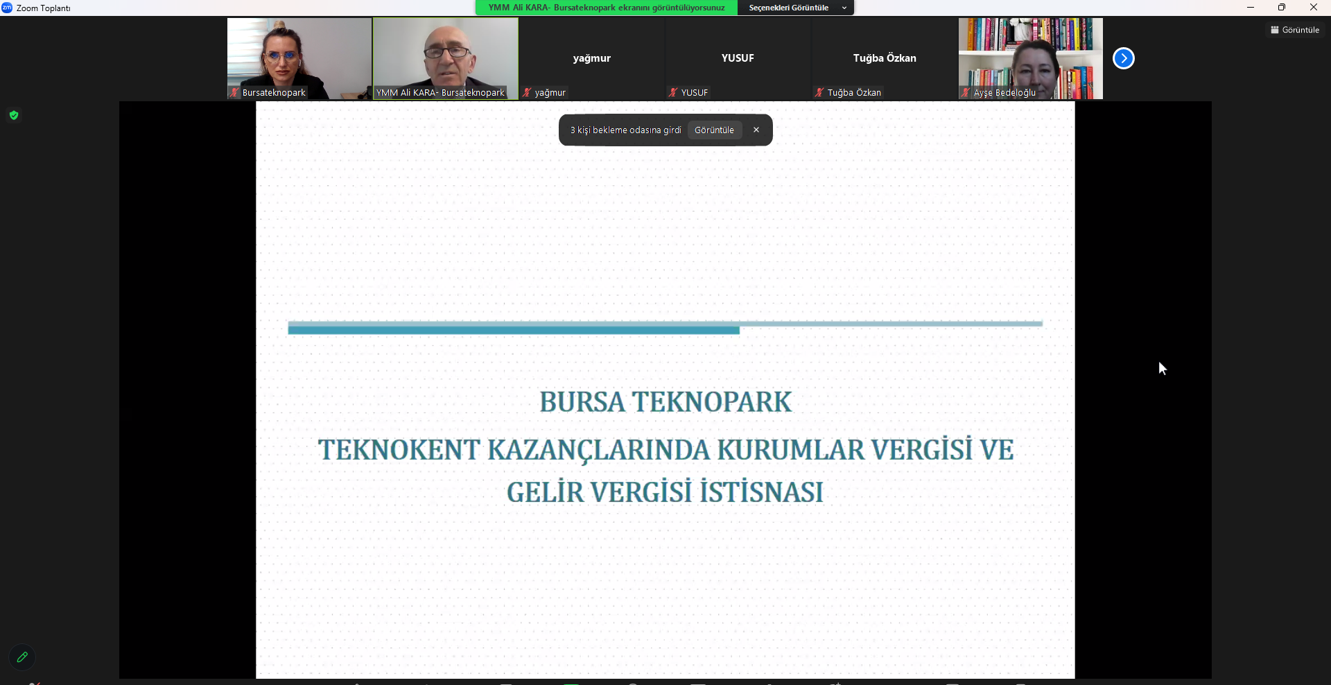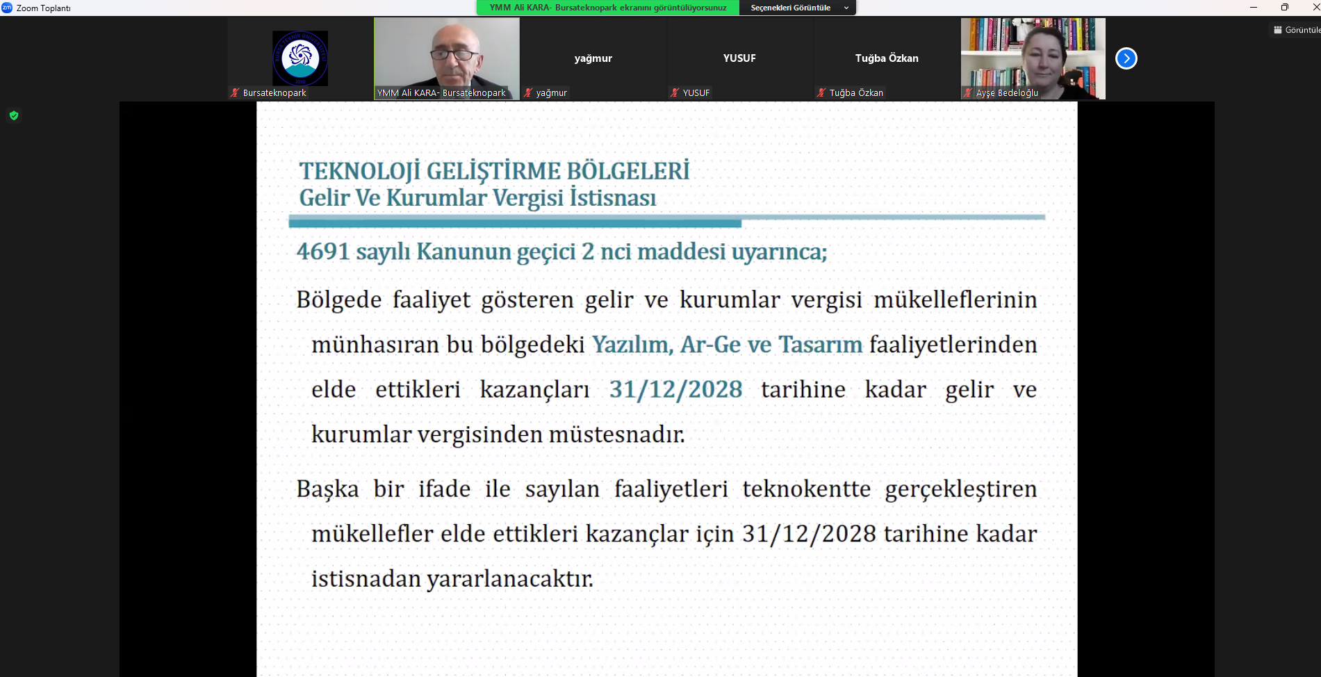 Bursateknopark firmalarımızın ve paydaşlarımızın katılımları ile Yeminli Mali Müşavir Ali KARA’nın konuşmacı olarak yer aldığı “Teknopark Kazançlarında Kurumlar Vergisi ve Gelir Vergisi İstisnaları Bilgilendirme Toplantısı” çevrimiçi olarak gerçekleştirildi. Toplantıda istisnaların hesaplanmasında izlenecek yöntemler ve dikkat edilmesi gereken hususlar üzerinde duruldu. Katılımcıların soru cevapları ile birlikte toplantı sona erdi.